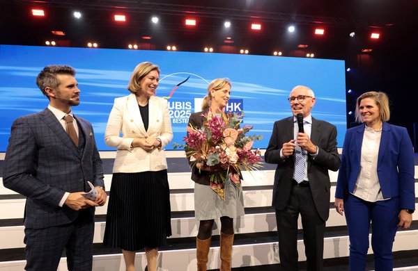 (5) Thore Schölermann, Moderator, Dr. Helena Melnikov, HGF DIHK, Karin Prien, Bundesministerin für Bildung, Familie, Senioren, Frauen und Jugend, Peter Adrian, DIHK-Präsident, Swaantje Creusen, Vorsitzende des DIHK-Bildungsausschusses